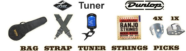 Included in this pack:Â Clip-on chromatic tuner, Black carry bag, LM banjo strap, Dunlop nickel thumb and finger picks and a bonus set of Banjo Strings.