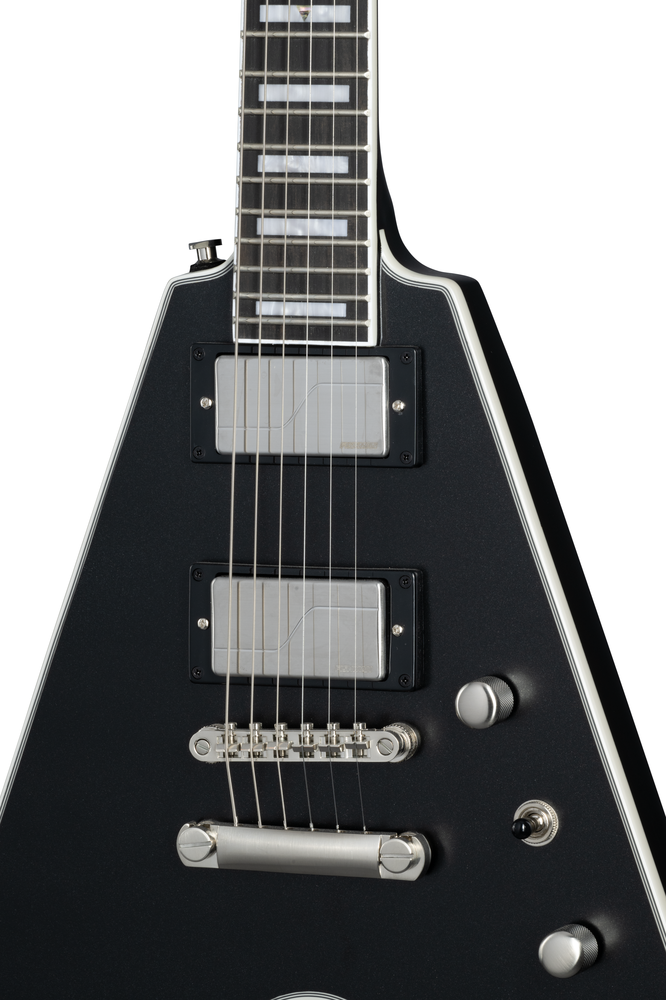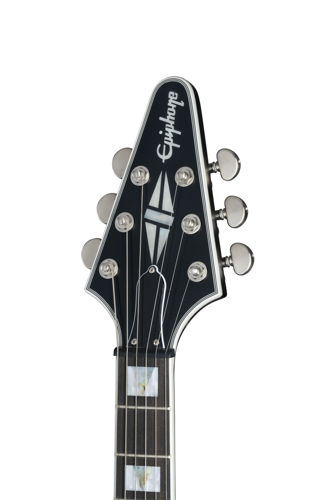 The Flying V™ Prophecy also includes Grover® locking Rotomatic® tuners, Epiphone’s LockTone™ Tune-O-Matic™ bridge and tailpiece for added sustain, a Graph Tech® NuBone® nut that boosts harmonic content and increases tuning stability, custom binding, ebony fretboard, jumbo frets, PosiLok strap buttons, and an asymmetrical SlimTaper™ neck for comfort and speed. A premium gig bag is included
