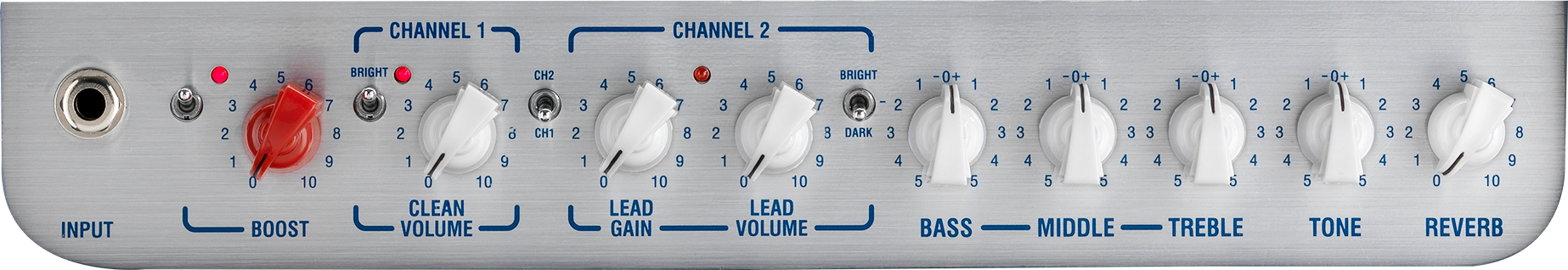 Top panel controls: pre-boost, clean bright switch, clean volume, channel switch, drive gain, drive volume, drive tone character (normal, bright, dark), bass, middle, treble, master tone, reverb.